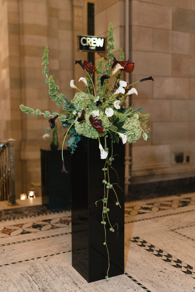 Long black tables dressed with layered textures and glowing candlelight from Celebrations Group, Luxe Rentals, and Simply Beautiful Decor created an atmosphere of understated luxury. The floral designs by Atelier Carmel added movement and softness, perfectly balancing the venue’s historic architecture.